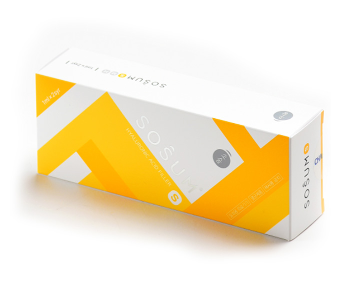 Sosum S is a stabilized hyaluronic acid- (HA)-based filler with high cross-linking rate. Sosum fillers have outstanding density, viscosity, and elasticity. The reaction of HA cross-linking is held under low temperatures, which allows obtaining dense and finely packed HA gel structure. Two-step purification of HA after the cross-linking reaction minimizes the level of residual BDDE. High cross-linking rate ensures longer effect duration due to enhanced resistance of HA to degradation. Zero residual BDDE and low endotoxin levels minimize allergic reactions and other side effects after the procedure. Low injection force of the HA gel guarantees uniform and painless distribution of the filler during injection.